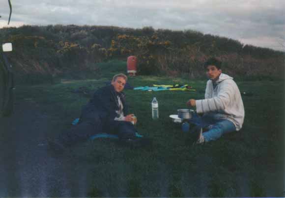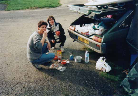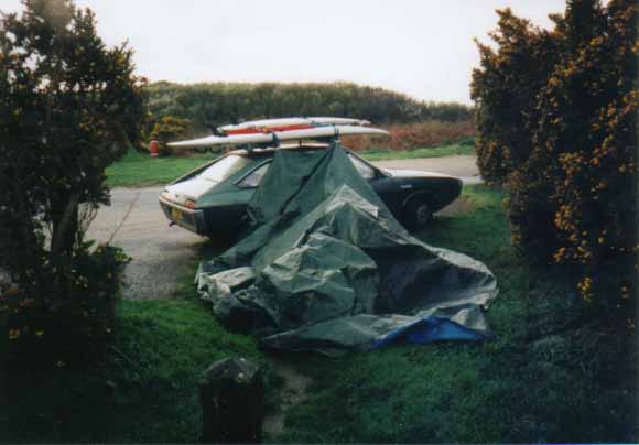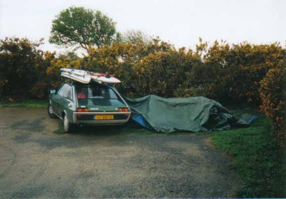 Tout d'abord nous avions un merveilleuse tente de militaires achetée par Marco dans un magasin de daube à Redon. Il n'y avait pas de sol et les sardines et les piquets étaient en bois. En fait on a mis une bâche en dessous et une au dessus. On aurait pu la virer ca n'aurait rien changé. D'ailleurs on ne s'en était servi qu'une fois auparavant, à savoir dans le jardin de mes grands parents sous les yeux de ma grand mère horrifiée d'une part de nous voir dormir dehors et d'autre part de dormir sous une telle épave (sous n'étant pas forcément le mot parce qu’au bout d'une heure on l'avait pétée et on dormait à la belle étoile). Bref aujourd'hui personne ne sais ce qu'elle est devenue. Certaines rumeurs prétendent qu'elle serait toujours derrière la cheminée de l'ancien appart de Marco rue St Melaine à Rennes, mais la dernière fois qu'elle fut aperçue fut lors de cette mémorable semaine de surf.