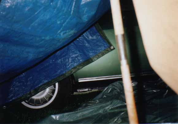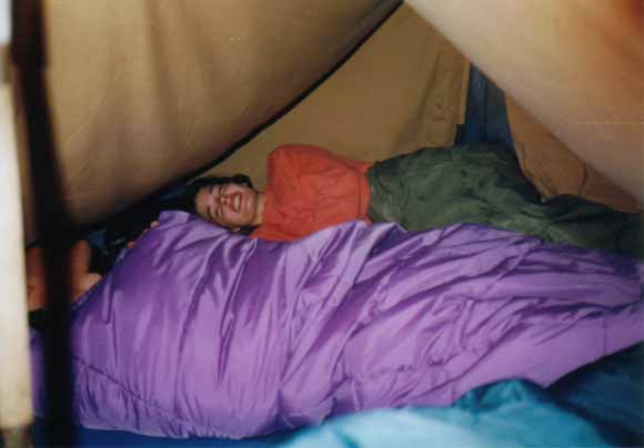 Tout d'abord nous avions un merveilleuse tente de militaires achetée par Marco dans un magasin de daube à Redon. Il n'y avait pas de sol et les sardines et les piquets étaient en bois. En fait on a mis une bâche en dessous et une au dessus. On aurait pu la virer ca n'aurait rien changé. D'ailleurs on ne s'en était servi qu'une fois auparavant, à savoir dans le jardin de mes grands parents sous les yeux de ma grand mère horrifiée d'une part de nous voir dormir dehors et d'autre part de dormir sous une telle épave (sous n'étant pas forcément le mot parce qu’au bout d'une heure on l'avait pétée et on dormait à la belle étoile). Bref aujourd'hui personne ne sais ce qu'elle est devenue. Certaines rumeurs prétendent qu'elle serait toujours derrière la cheminée de l'ancien appart de Marco rue St Melaine à Rennes, mais la dernière fois qu'elle fut aperçue fut lors de cette mémorable semaine de surf.